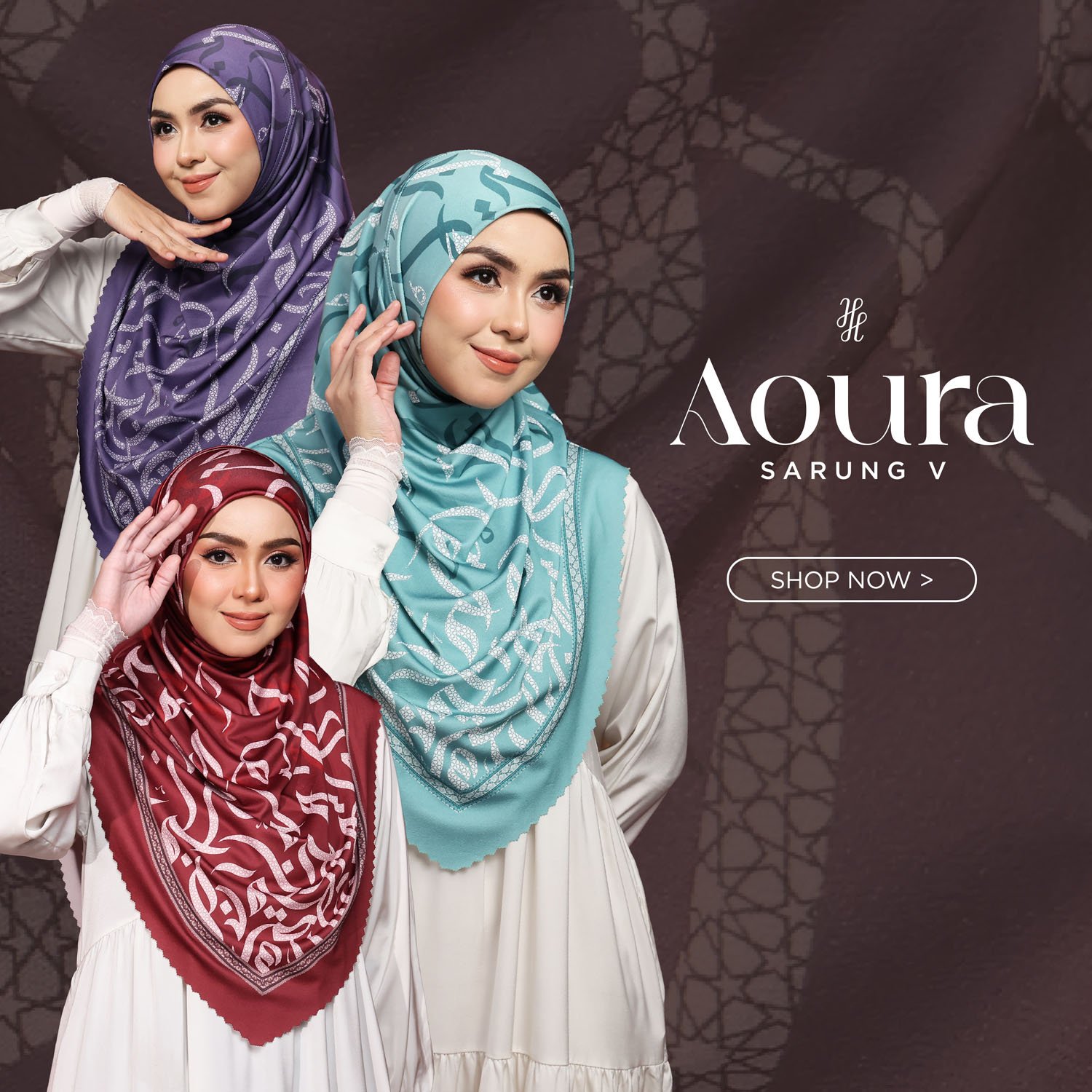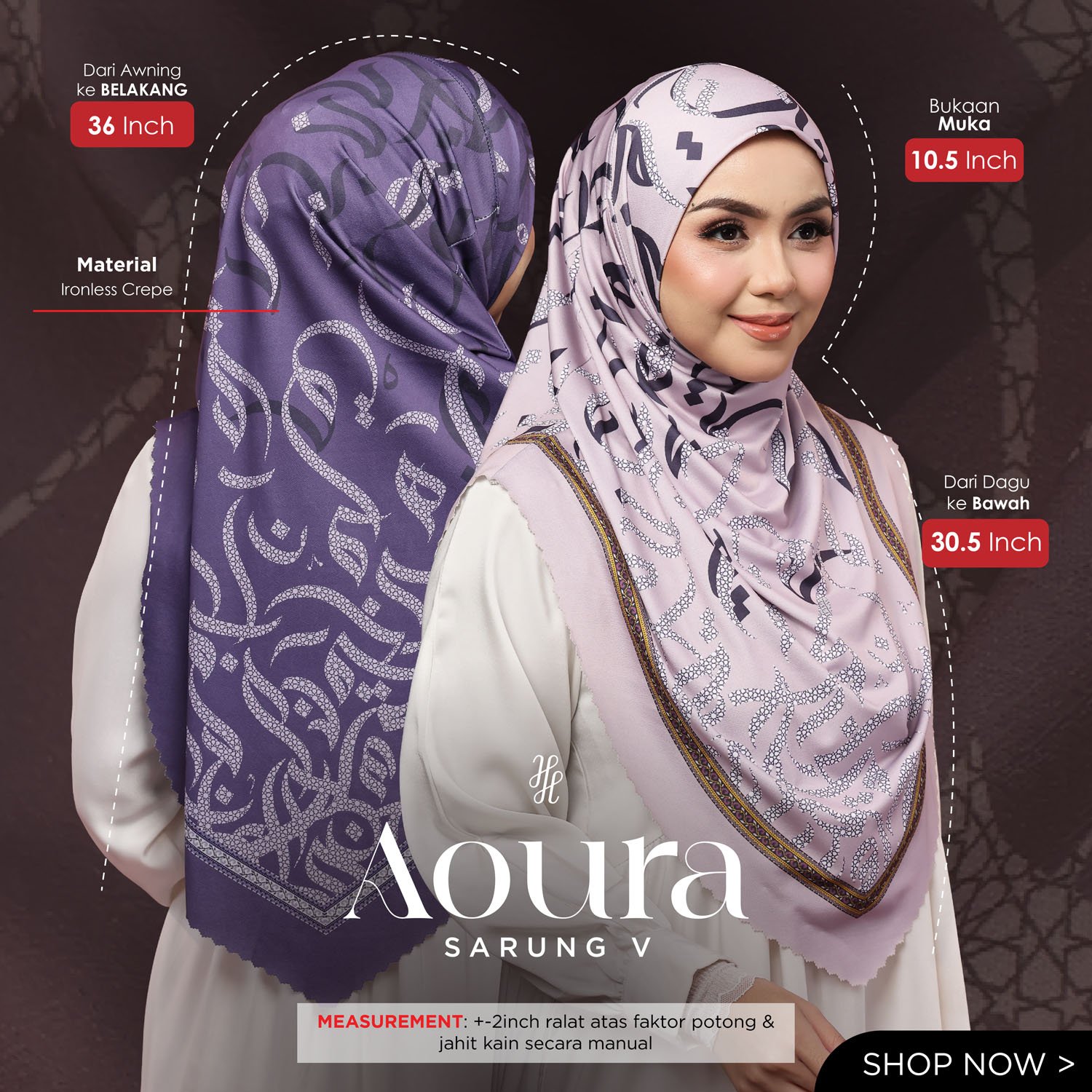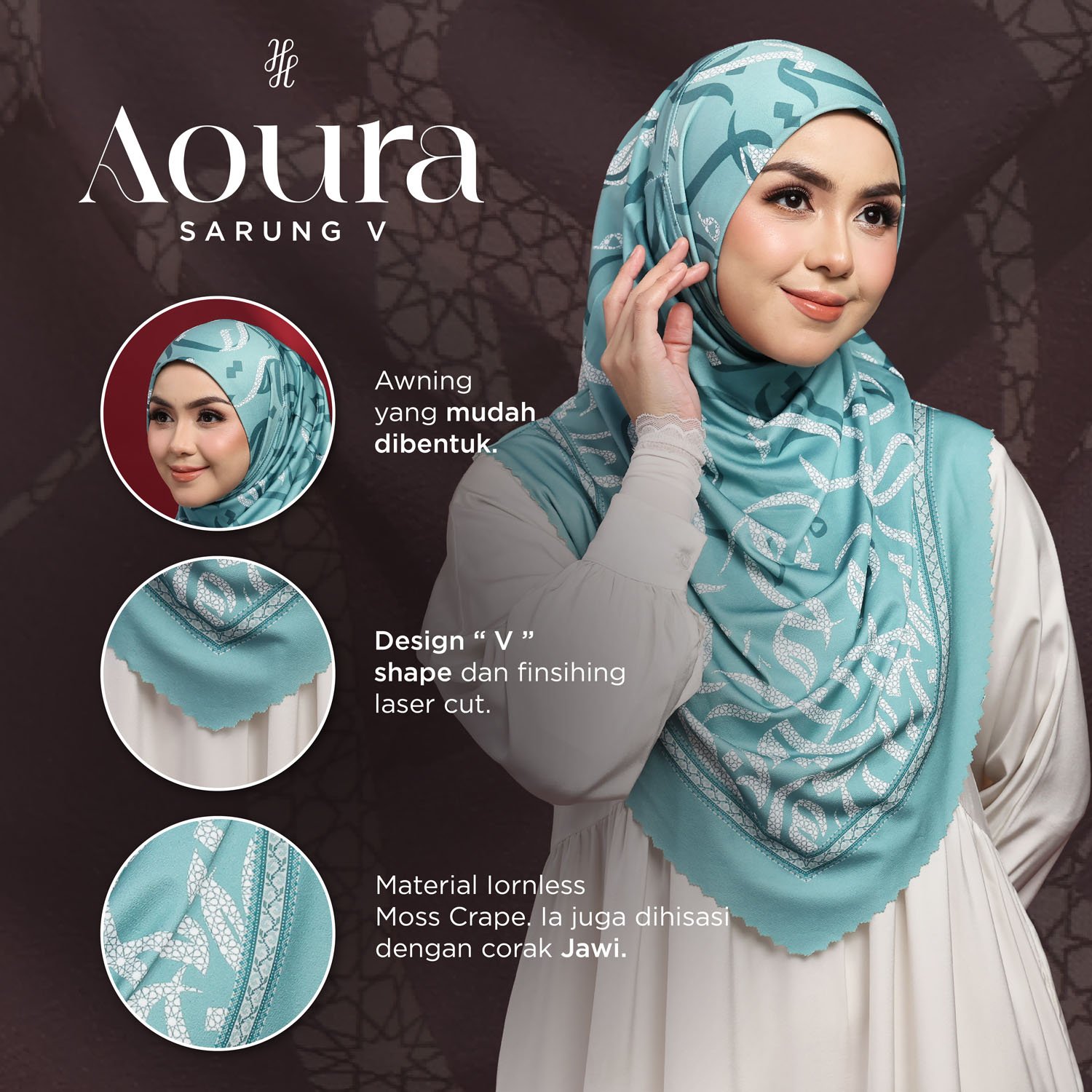 - Tudung Hijab Aoura Instant – Premium Moss Crepe dengan V-Shape Laser Cut yang menarik. Tudung ini siap dipakai dan tidak memerlukan set.